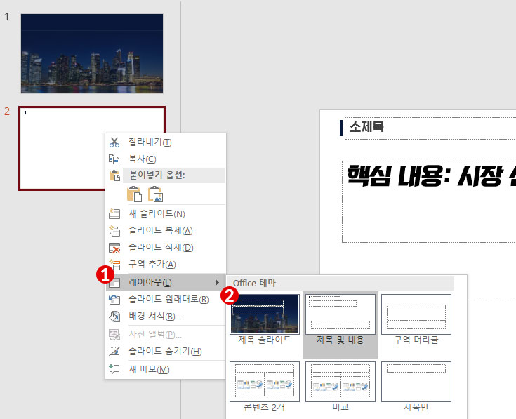 슬라이드 마스터 설정 후, 실제 PPT 작업 공간에서 적용할 때에는, 좌측의 슬라이드 리스트에서 마우스 우측버튼 클릭, [레이아웃]-[Office 테마]에서 설정할 수 있습니다.