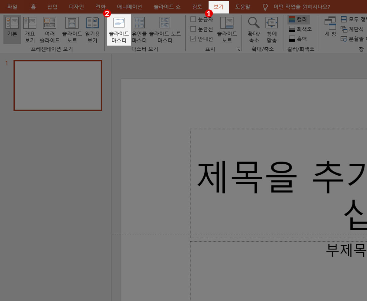 먼저 상단 메뉴 중, [보기] 메뉴 하단의 [슬라이드 마스터] 아이콘을 클릭하여, 슬라이드 마스터를 편집할 수 있는 영역으로 전환합니다.
