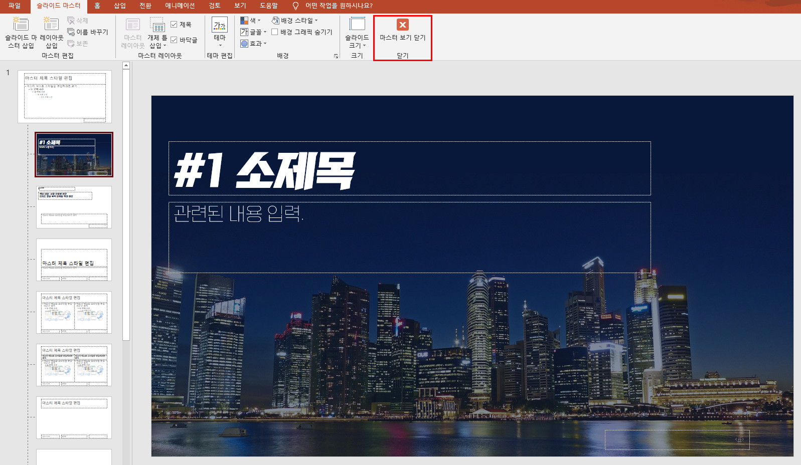 사용 방법은 위의 이미지처럼 슬라이드 마스터 내 슬라이드 작업영역에서 각 주제에 맞는 슬라이드 디자인을 해준 뒤 [슬라이드 마스터] 메뉴 하단의 [마스터 보기 닫기] 아이콘을 클릭해주시면 됩니다.